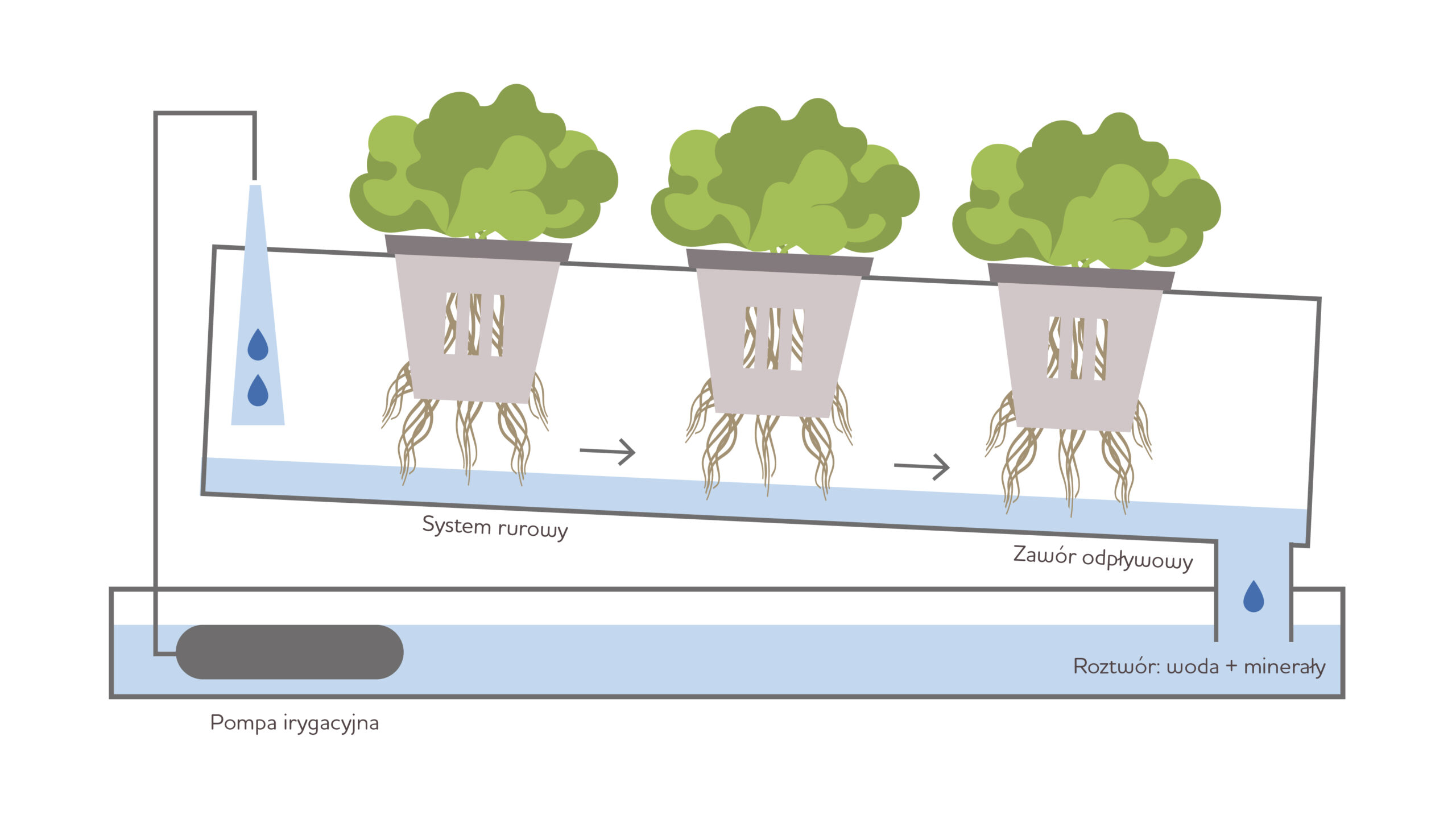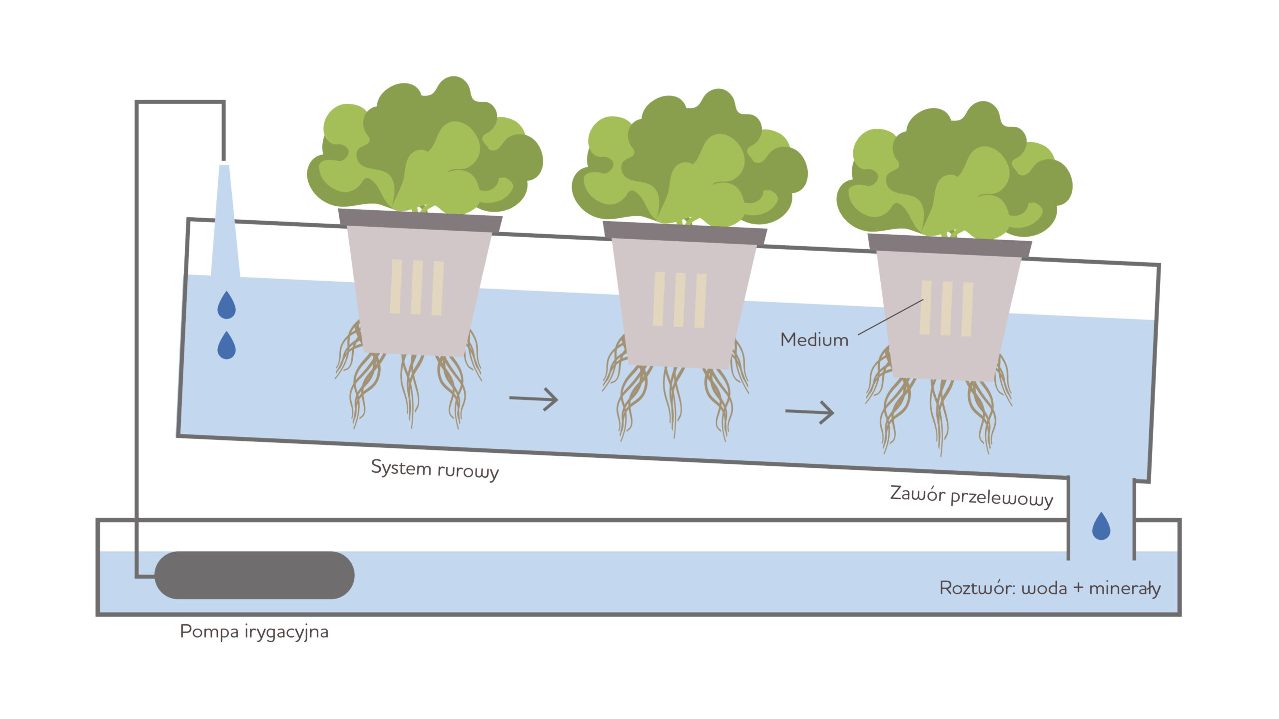 System aktywny wykorzystujący pompę która „zalewa” rośliny (do pewnego ustalonego poziomu) wodą z minerałami. Zalane rośliny znajdujące się w koszykach lub doniczkach pobierają wymaganą ilość pożywki. Po wyłączeniu pompy, poziom wody opada. Woda powraca do oddzielnego zbiornika za pomocą prostego systemu powrotnego. Część wody pozostaje w zbiorniku z roślinami na wypadek ewentualnej awarii pompy. Podczas wielokrotnego napełniania oraz opróżniania woda zostaje natleniona szczególnie przy systemie korzeniowym rośliny, co prowadzi do bardzo dobrego wzrostu roślin. Proces przepływu wody ustalamy adekwatnie do uprawianych roślin za pomocą timera (czasomierza).