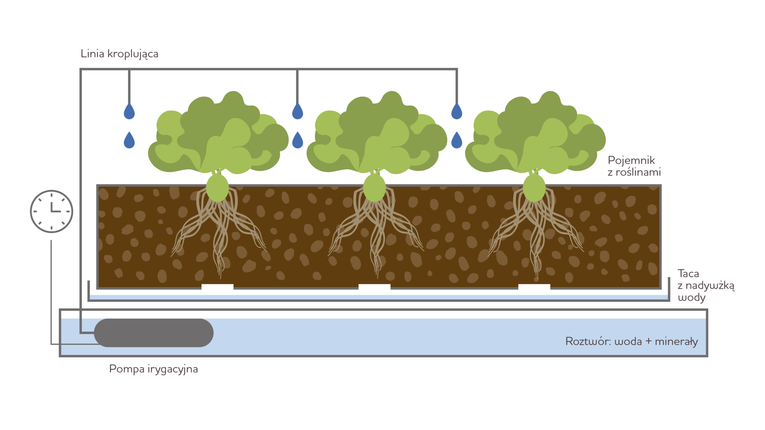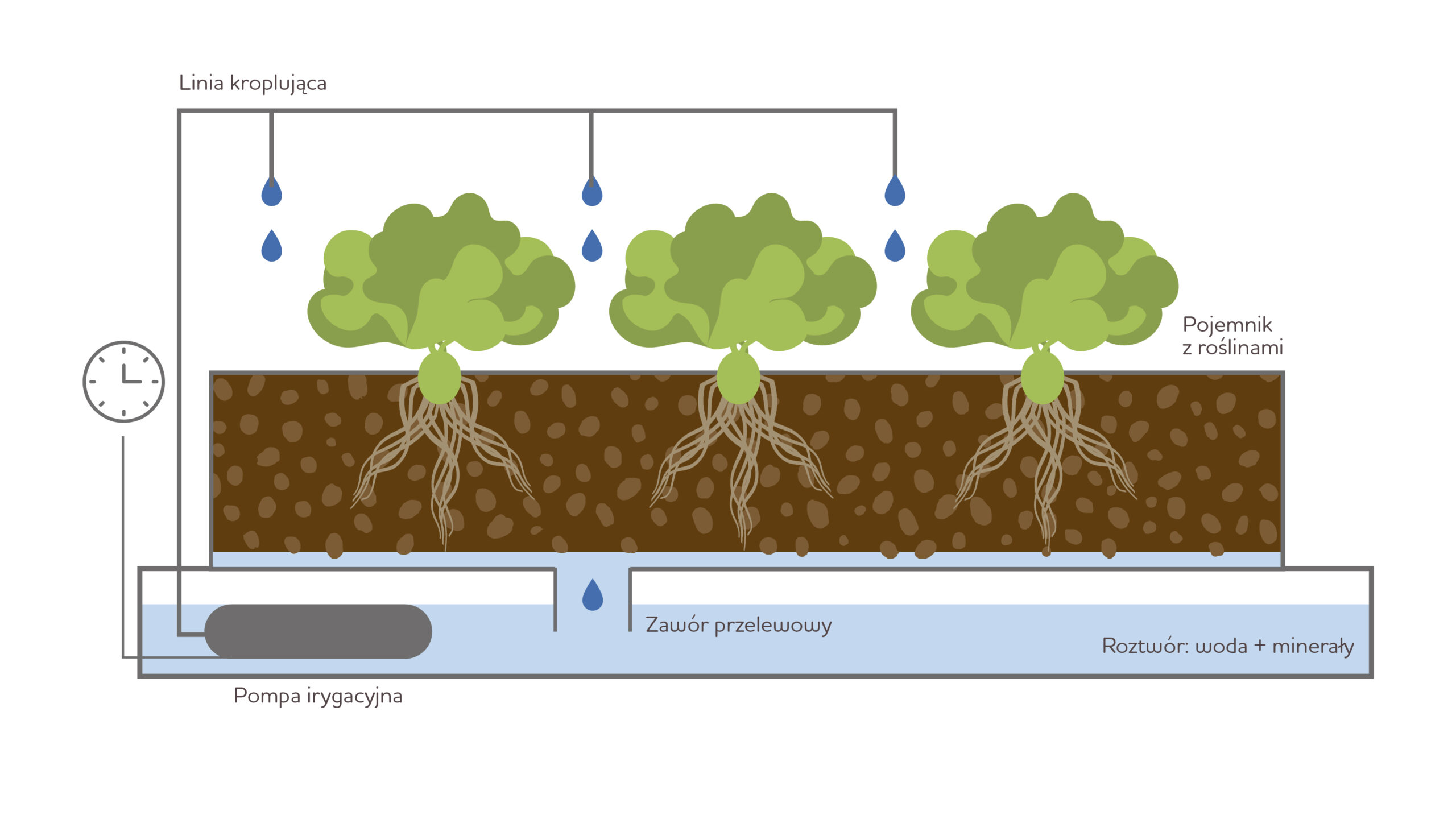 Aktywny system, zbudowany z linii kroplującej gdzie roztwór wodno-mineralny za pomocą kroplowników dozuje krople na podłoże roślinne. Roztwór składników odżywczych przepływa wokół korzeni, dzięki czemu jest on bezpośrednio dostarczany. Nadmiar płynu spływa, wciągając tlen do obszaru korzenia, co jest ważne dla wzrostu rośliny.