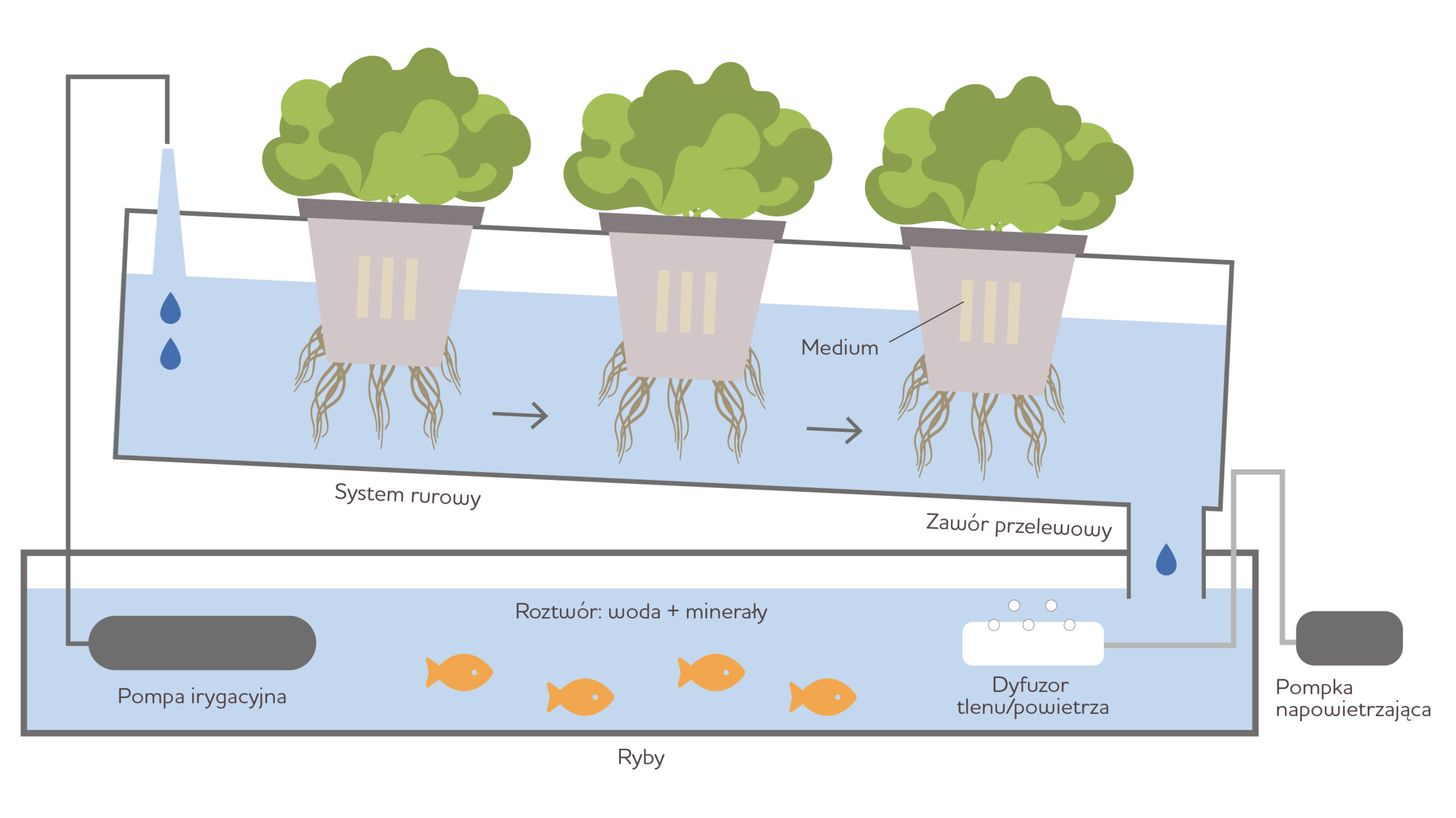 System aktywny, oparty na hodowli ryb (akwakultura) i uprawie roślin (hydroponika) oba te systemy są połączone ze sobą. Odchody ryb wykorzystywane są jako nawóz dla roślin, poddane recyklingowi dostarczane są do roślin w postaci nawozu. Odchody ryb przekształcane są w nawóz za pomocą mikroorganizmów, równolegle odbywa się proces oczyszczania wody oraz jej napowietrzenia, dzięki czemu może być ona z powrotem dostarczona do zbiornika z rybami. Tworzy to cykl korzystny dla obu stron, ryb oraz roślin (win-win). Oprócz uprawy roślin hodujemy również ryby, które mogą być wykorzystane jako pokarm dla ludzi, a w przypadku ryb ozdobnych utrzymujemy zbiornik w czystości.