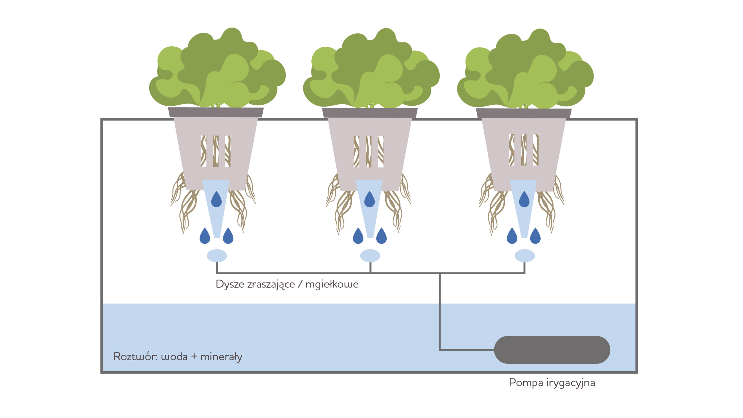 System aktywny, podobny jest do systemu DWC. Rośliny w podłożu (np. podłożu organicznym) umieszczone są w doniczce, a następnie na tacce. Korzenie natomiast znajdują się we mgle roztworu wodno-mineralnego, która rozprowadzana jest przez dysze mgłowe. Systemy aeroponiczne zapewniają optymalne zaopatrzenie korzeni we wszystko, czego potrzebują do wzrostu i rozwoju. Takie systemy działają bardzo skutecznie i zapewniają maksymalny wzrost roślin. Jednak złożoność techniczna jest wysoka ze względu na wysokie ciśnienie wody w stosowanych dyszach lub nebulizatorach. Ponadto należy pamiętać o częstych przeglądach systemu, aby zapobiec zatykaniu się dysz. Wadą jest to, że awaria pompy ciśnieniowej nie jest długo tolerowana przez swobodnie wiszące korzenie roślin.